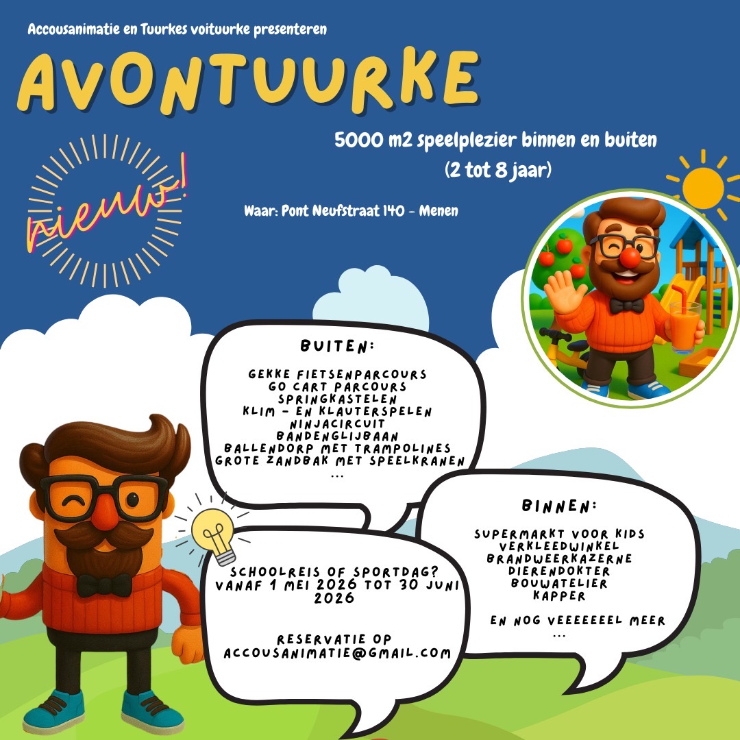 Ontdek Avontuurke, de gloednieuwe speelplek van Accousanimatie en Tuurkes voiturke! Goed voor 5000 m² binnen- en buitenspeelplezier voor kinderen van 2 tot 8 jaar.